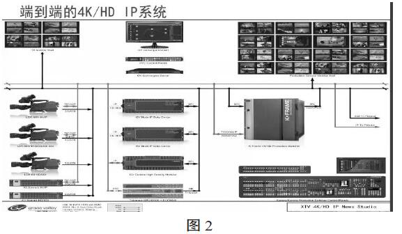 IP技術在廣電行業里面已經應用很久,什么樣的架構才符合現在的行業需求?所有IT架構里面較典型的數據中心的架構是分層架構,有核心層、匯聚層、應用層。其中核心和匯聚層沒有區別,真正跟業務相關的是應用層。對此,草谷公司認為首先不會改變IP化本身架構,不繼承傳統廣播電視單體設備化的方向,這樣就得到真正為廣播電視服務的數據中心。基于上述概念,草谷公司建立正式的4K/HD IP系統和傳統系統是不一樣的,不再是從左到右線性化圖。如圖2所示。